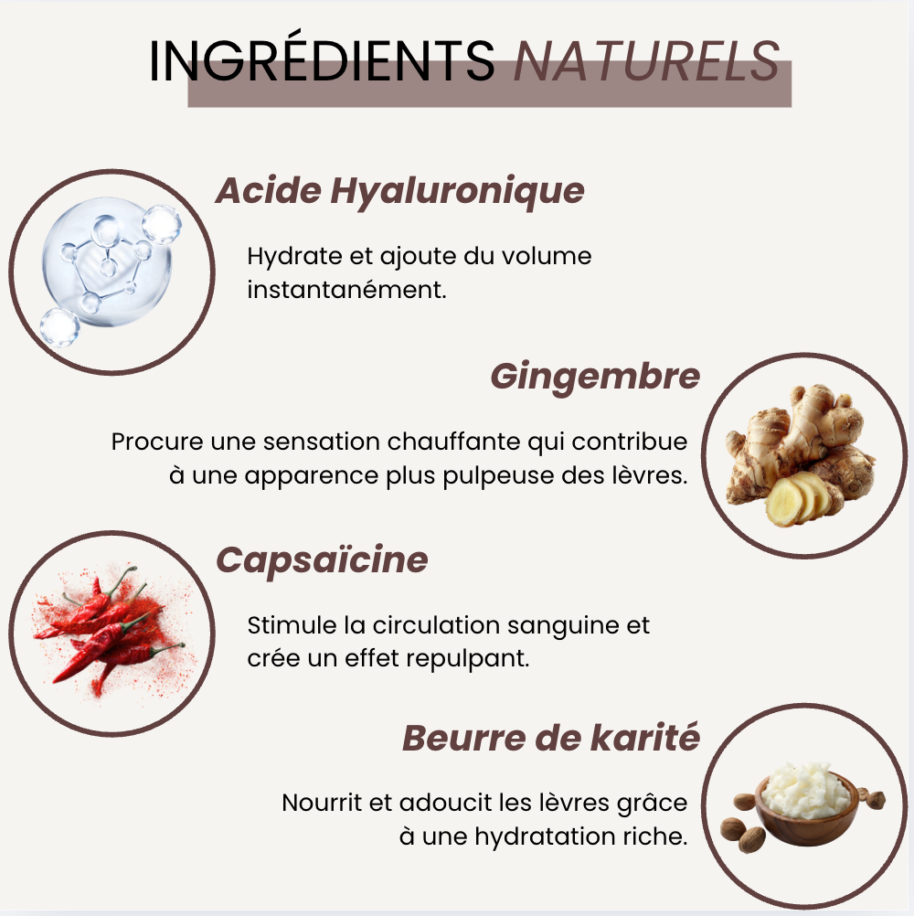 Des ingrédients d’origine naturelle pour offrir plus de volume et de définition à vos lèvres.